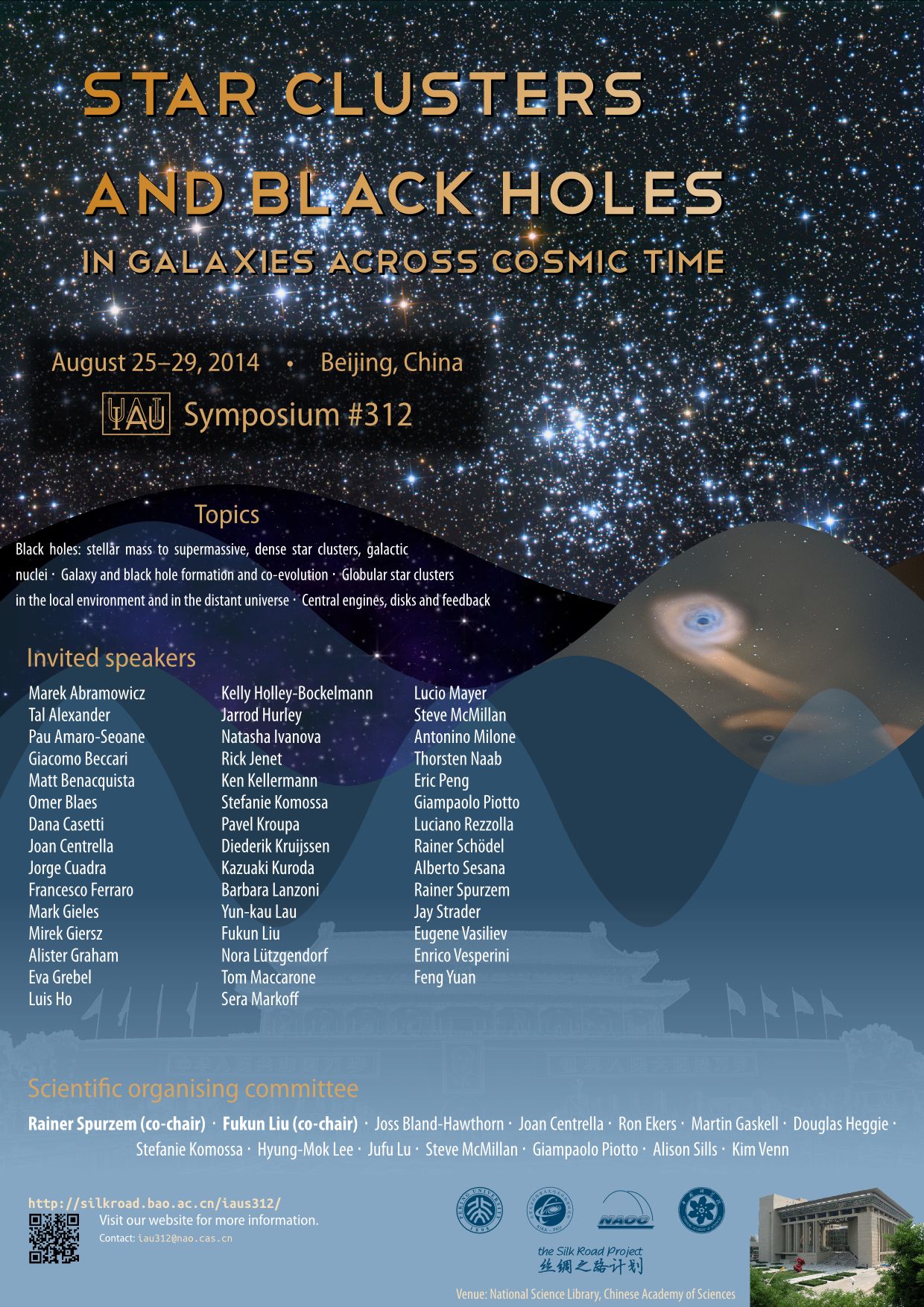 I was one of the local organizers of the 312th Symposium of the International Astronomical Union (IAU) Star Clusters and Black Holes in Galaxies across Cosmic Time that took place at the National Science Library of Chinese Academy of Sciences in Beijing in summer 2014. While I didn’t choose this mouthful of a name for the conference, I designed the lovely poster and was chief editor of the conference proceedings (hardcover by Cambridge University Press, ISBN-13: 9781107078727).