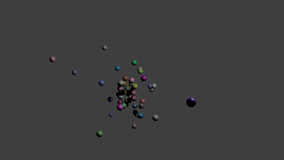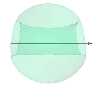 My Ph. D. thesis (digital copy available on request) focused on stars around a supermassive black hole binary. This animation shows the stability volume in velocity space for a star in the equatorial plane of such a supermassive black hole binary, or a planetoid in the equatorial plane of a binary star. Velocities inside the volume produce stable orbits while velocities outside it produce unstable ones. In the presence of a single gravitational object at the centre of the system instead of a binary, the stability volume looks like a sphere: stable orbits are ones with velocity magnitudes smaller than the local escape velocity. If the central object has a finite size though, a loss cone is carved, where orbits with low angular momentum produce radial orbits, which are said to be unstable because they lead to tidal disruption (or being swallowed) by the central object. So in this case, the loss cone would appear as a cylinder in this velocity presentation. When the central object is a binary, the loss cone becomes much larger, because in addition to tidal disruption, the orbit can be dynamically unstable: in other words one of the black holes can kick the star out of the system. The fact that the binary supermassive black hole is rotating in a particular orientation breaks the symmetry: stellar orbits which are retrograde with respect to the central binary are more stable than prograde ones. This leads to the enlarged cylinder to also be distorted.
