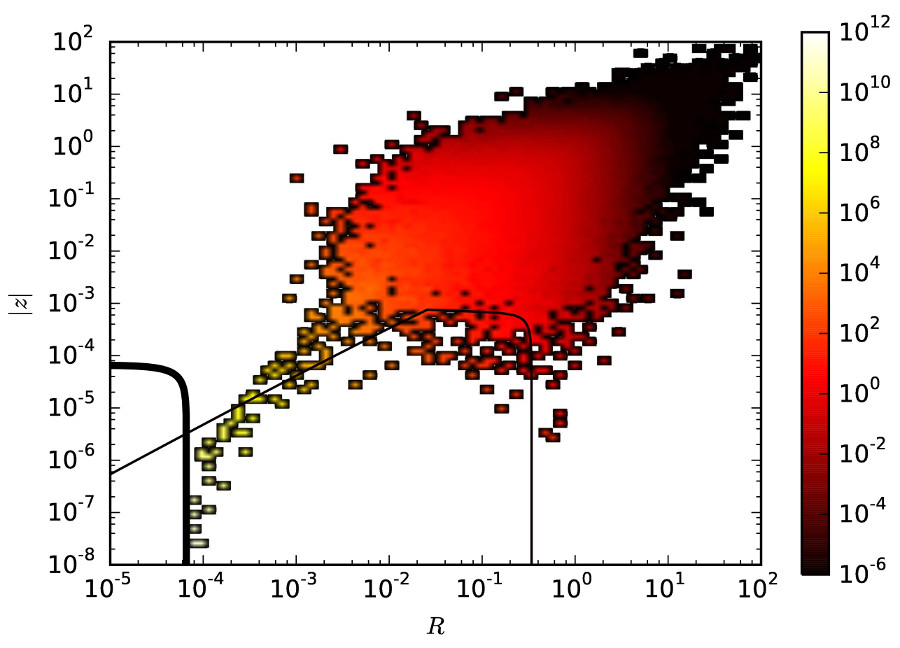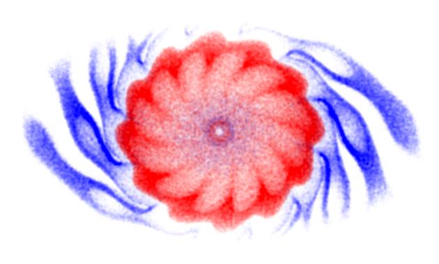 This beautiful image has no deep meaning, it’s just a visualization of numerical error. I used my ETICS code to calculate the gravitational force in a triaxial ellipsoid in single and double precision, with the difference being the numerical error. The error distribution is bimodal, and the blue and red dots are points around the two peaks.