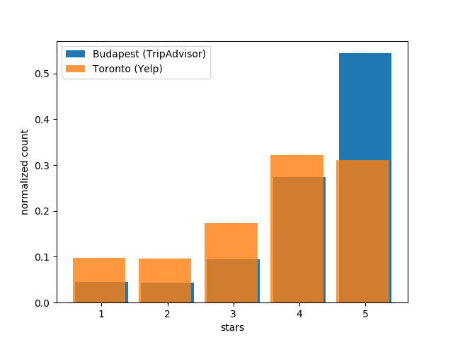 Over a year ago I analyzed restaurant reviews in Budapest and came up with a complimentary way to rank businesses. This was based on the 4- and 2-star reviews rather than the average score. I followed up by repeating this analysis for Toronto. Below are the results (particularly comparing the two cities) and some new thoughts.
